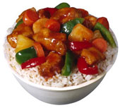 Succulent chicken pieces with pineapple,onion & green pepper in a tasty sweet & sour sauce,served on a bed of rice.